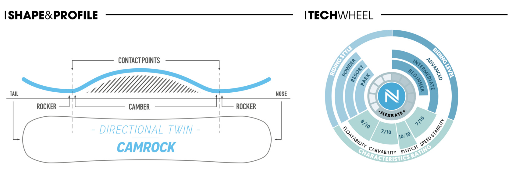Standard CamRock: Лучшая комбинация рокер/кембер на сегодняшний день - классический прогиб между закладными и равномерно распределенные рокерные зоны в носу и хвосте дадут отличные впечатления от катания на любых склонах и в любых условиях.