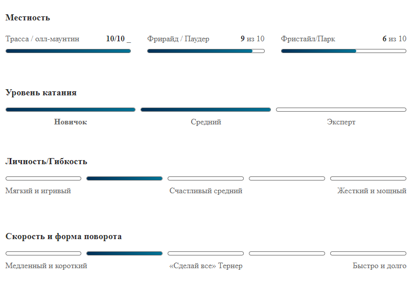 - Прогиб Directional Rocker: ярко выраженный кембер в зоне между креплений прогибает носовую часть в рокер, помогая быстро двигаться даже в самом глубоком снегу, а также гарантирует стабильность и контроль на трассе;
